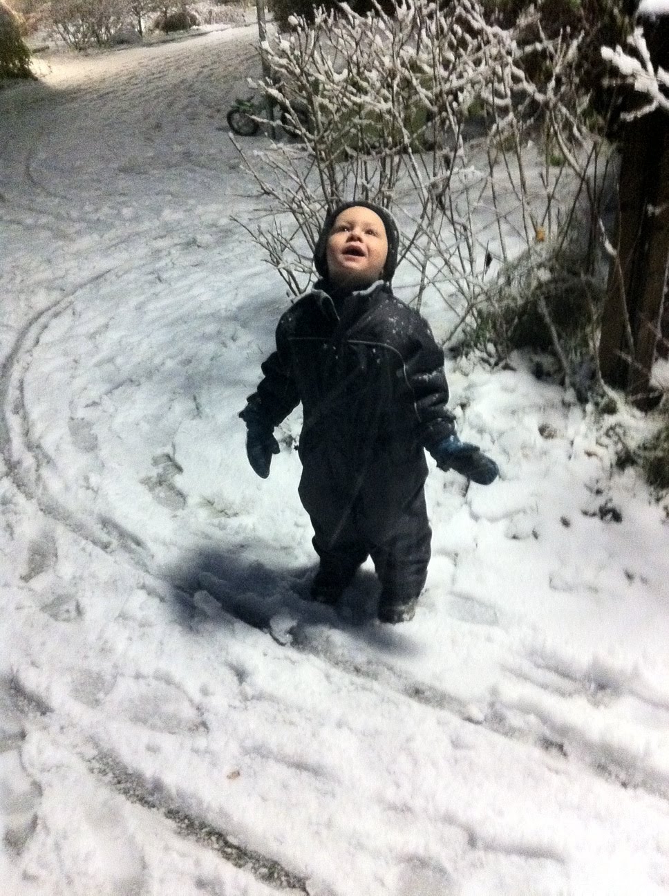 Snön kom visserligen i tisdags då bilden togs, men vi har fortfarande lite småhögar kvar och jag tycker det är mysigt. Den här bilden på Lucas blev det lite Narnia-känsla på.